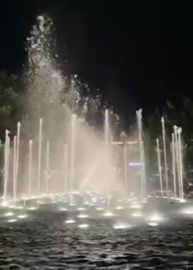fountain show at night. Water shoots up from several points in a circular pool, illuminated by white lights underneath. The water forms various shapes, including tall columns and wide fan-like sprays. The background is dark, with some trees visible on the edge of the frame. In the distance, there are some blurred lights from nearby buildings.