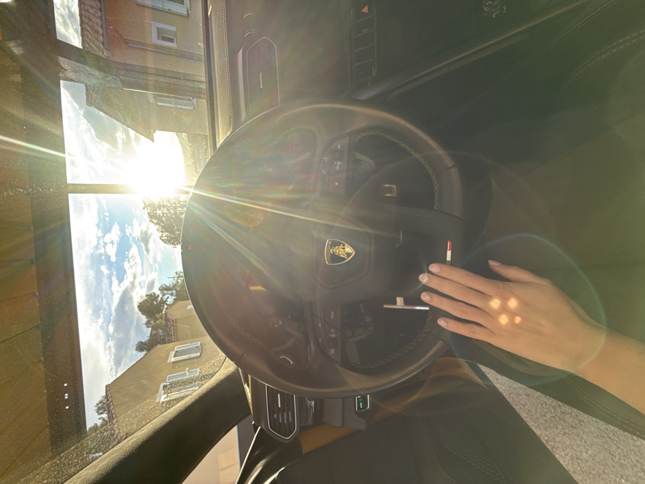 - "An interior shot from a vehicle depicts a fair-skinned left hand resting on the lower portion of a black leather-wrapped steering wheel, identified by a gold Lamborghini emblem in its center" by FM-yjK1X2, licensed under CC BY 4.0