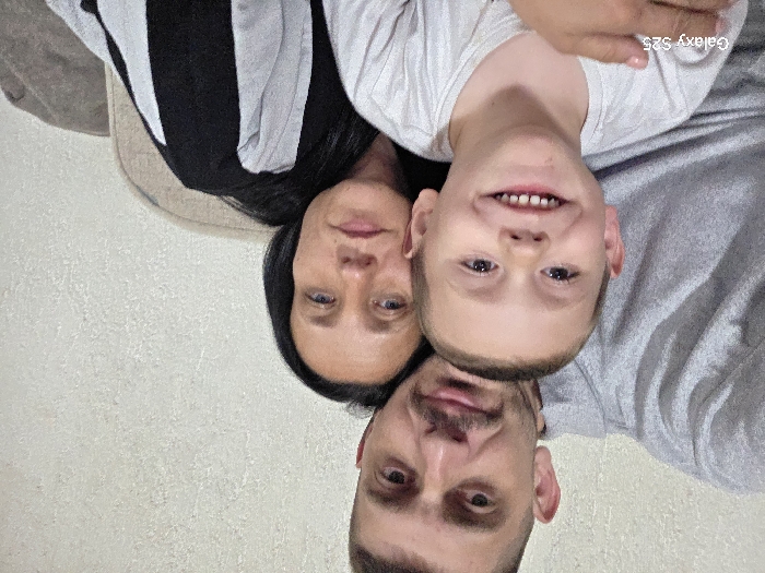 This image displays three individuals in an indoor setting in Karnalovo, Bulgaria. In the foreground, a young male child, approximately 5-7 years old, with short light brown hair and a white t-shirt, smiles broadly, revealing his teeth, and looks directly at the camera. A hand is visible resting on his right upper arm. Behind and slightly to the right of the child stands a male adult, estimated to be in his 30s-40s, with short dark hair, a trimmed beard, and a grey hooded sweatshirt. He maintains a neutral expression while looking at the camera. To the right of the child and adjacent to the male adult is a female adult, also appearing to be in her 30s-40s, with long dark hair and a black and white striped garment. She too looks directly at the camera with a neutral expression. The background features a light-colored, textured wall. A portion of a beige upholstered chair is visible to the right of the female adult. The bottom left corner of the image contains the text "Galaxy S25."
