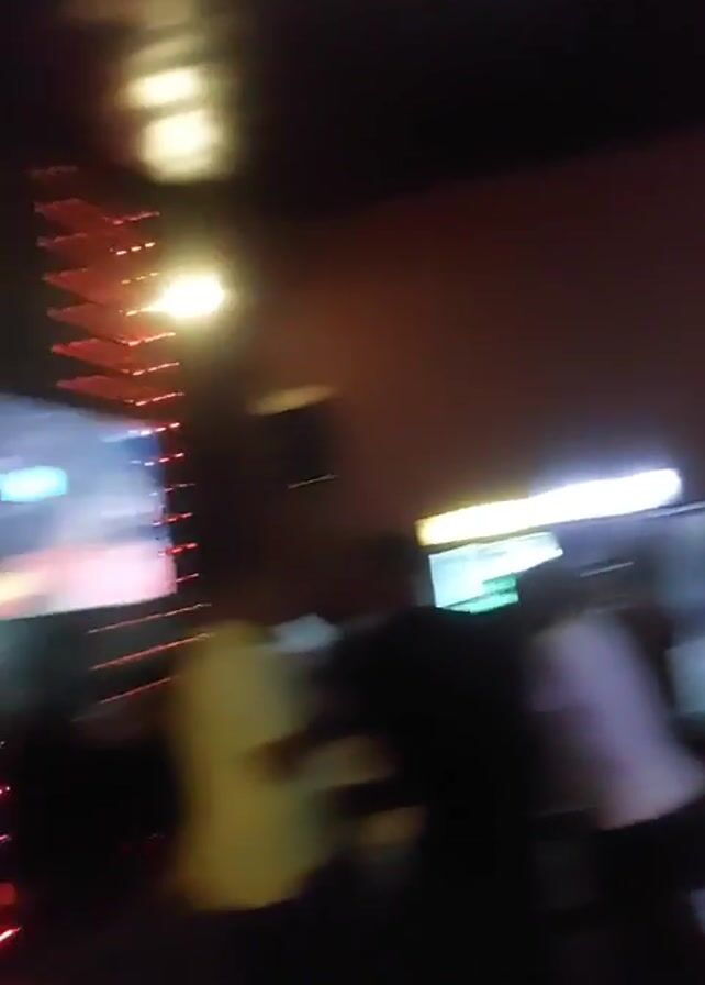 The video depicts a dimly lit indoor space, possibly a bar or lounge, filled with numerous people. The camera moves through the area, capturing glimpses of individuals standing and engaging in conversations. Background details include television screens, lighting fixtures, and shelves stocked with bottles.