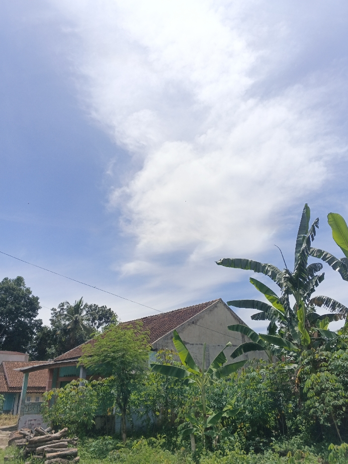 A bright, sunny day illuminates a rural scene. A cluster of houses with red-tiled roofs is nestled among lush greenery. Banana trees with broad, vibrant green leaves dominate the foreground, lending a tropical feel. Piles of logs lie on the ground near the homes. Overhead, a vast blue sky is dotted with soft, fluffy white clouds. A single, slender wire stretches across the scene.