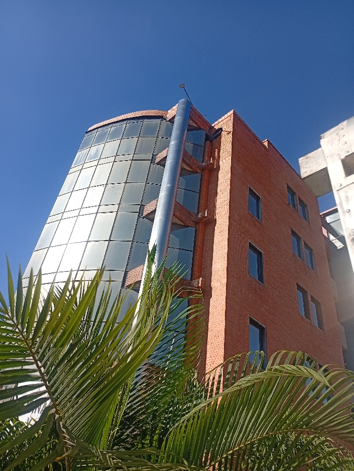 A multi-story building in Maracay, Venezuela, is depicted from an upward-angled perspective against a clear blue sky