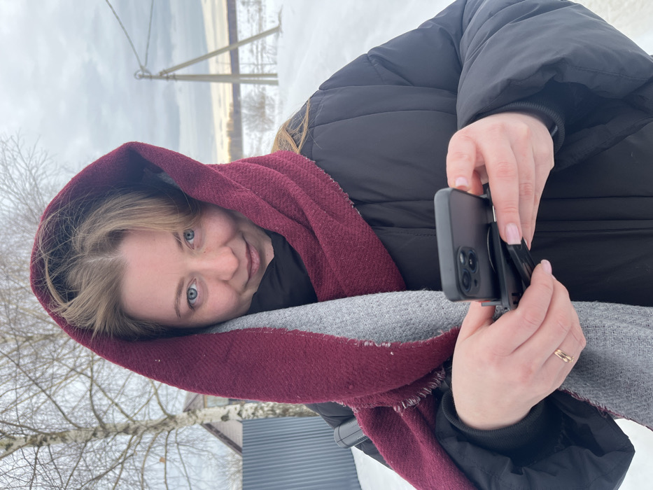 An adult female, appearing to be in her 20s or 30s, is depicted in a medium shot in an outdoor, snow-covered environment in Kalinino, Russia