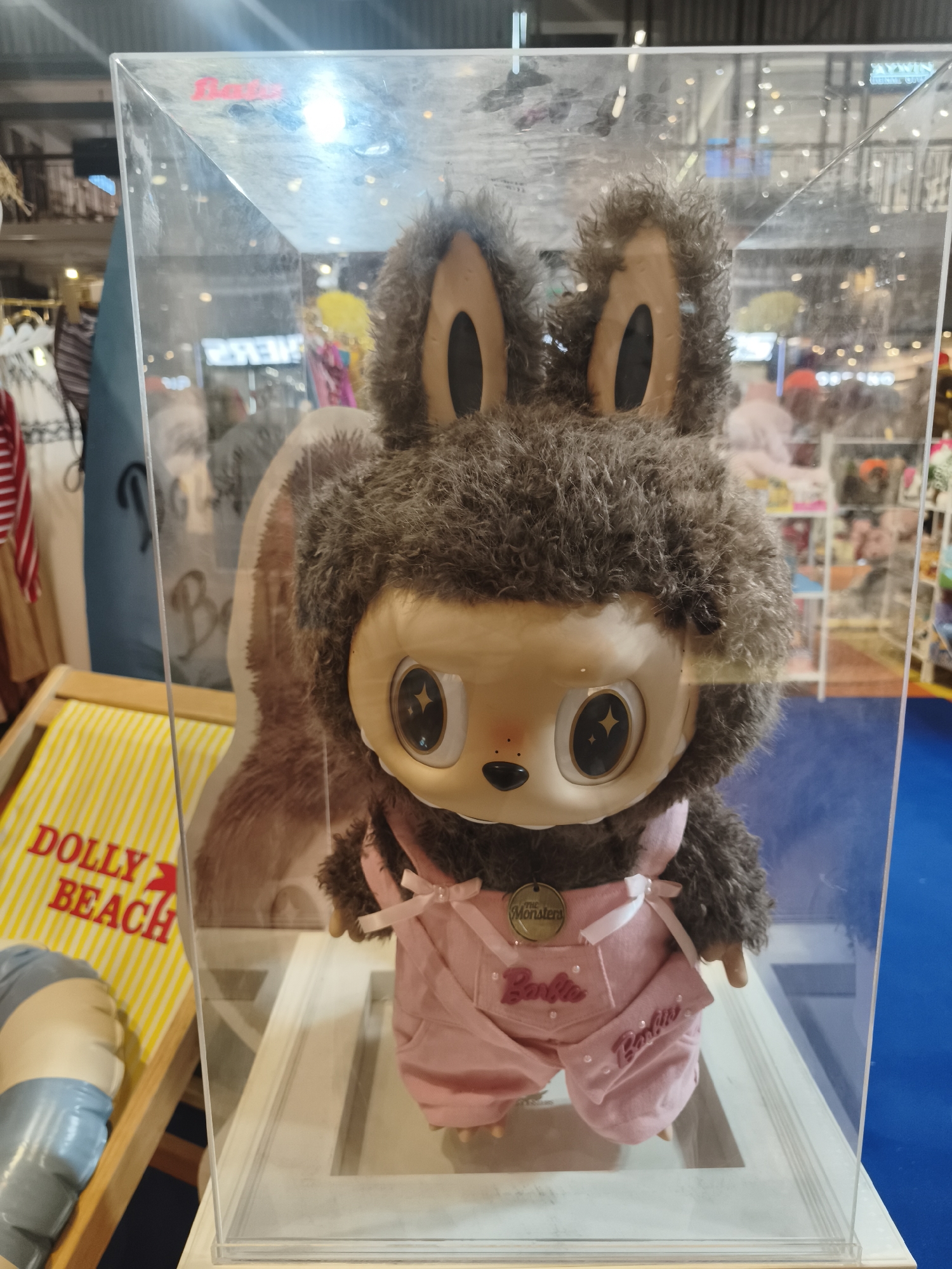 A brown, shaggy-furred plush toy, resembling a creature with large beige ears and a beige face featuring prominent black eyes with white star highlights, a small black nose, and six black freckle-like dots, is encased in a clear acrylic display box. The toy is dressed in light pink overalls with "Barbie" embroidered in dark pink script on the chest pocket and left leg pocket. A white ribbon bow with a clear bead is tied on the right shoulder strap, and a circular "The Monsters" tag is attached to the left shoulder strap. The display box sits on a white base. Reflections of overhead lighting and background elements are visible on the acrylic surface. Through and around the case, a retail environment is discernible. To the left, a yellow and white striped beach chair with "DOLLY BEACH" printed in red is partially visible, alongside a grey and beige inflatable object. Further left, clothing racks holding striped and white garments, and a partial teal banner with the letter "B" are present. In the blurred background, beyond the display, shelves with various merchandise, indistinct figures of people, and bright store lighting are visible. A section of blue flooring is present on the far right. A red logo, possibly "Blythe," is reflected on the top left corner of the clear display case. This scene is located within a commercial establishment, likely a shopping mall or department store, in บ้านบางรักษ์, Thailand.