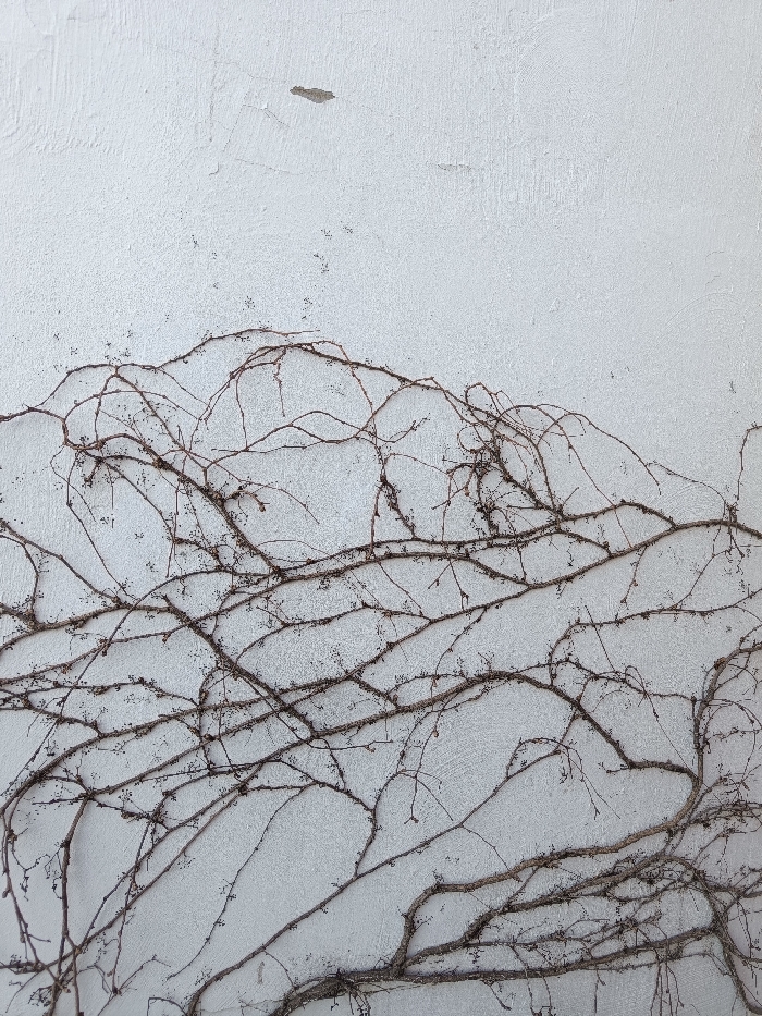 A weathered, light-grey textured wall, located in Obzor, Bulgaria, is depicted. The wall occupies the entire frame and exhibits minor surface imperfections, including small areas of chipped paint or plaster in its upper section. The lower two-thirds of the wall are covered by a dense, intricate network of leafless, brown woody vines. These dormant vines feature numerous fine branches and small, dark nodular structures, possibly remnants of dried berries or buds, clinging to the surface. The vine pattern forms a dense organic matrix against the uniform wall background. No people or active elements are present in the scene.