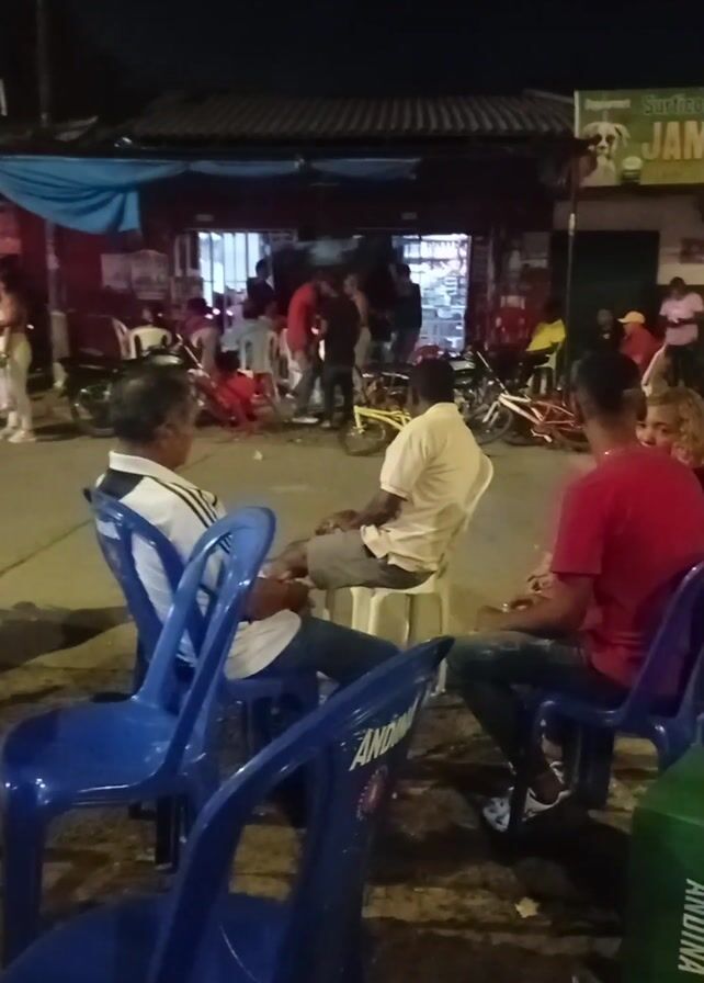 The video depicts a night scene with people sitting on blue plastic chairs outside of a bar or restaurant