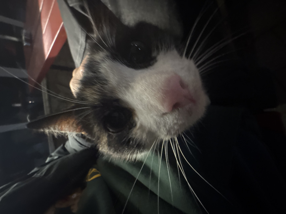 - "The scene depicts a domestic cat, primarily bicolored black and white with some brown markings on its head and ears, positioned on the lap of an individual in Pravets, Bulgaria" by FM-d9lRt2, licensed under CC BY 4.0