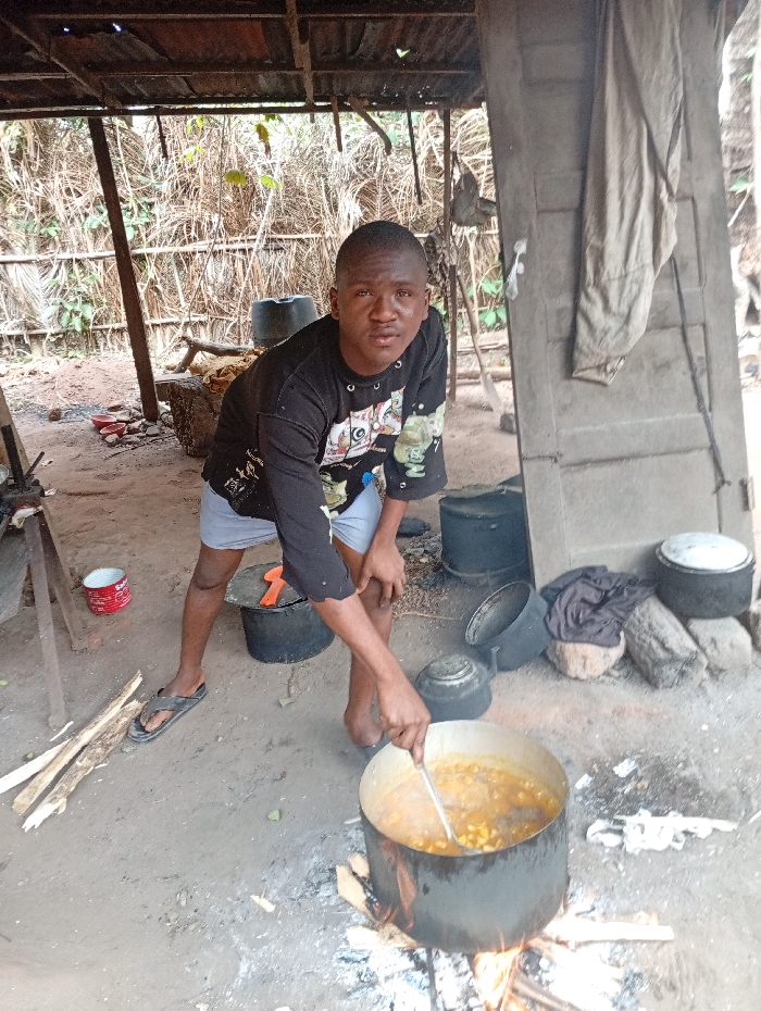 A person stirs a large pot over an open fire. The pot is set on the ground amidst ashes and burning wood. Several other pots surround the area. The person, dressed in a black shirt and shorts, is indoors, with a simple structure providing shelter. The ground is dirt, and there are wooden supports and a door visible. In the background, a cluttered, natural setting exists.