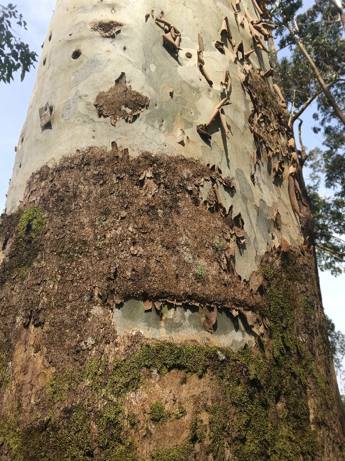 A towering tree trunk dominates the frame, showcasing distinctive bark features