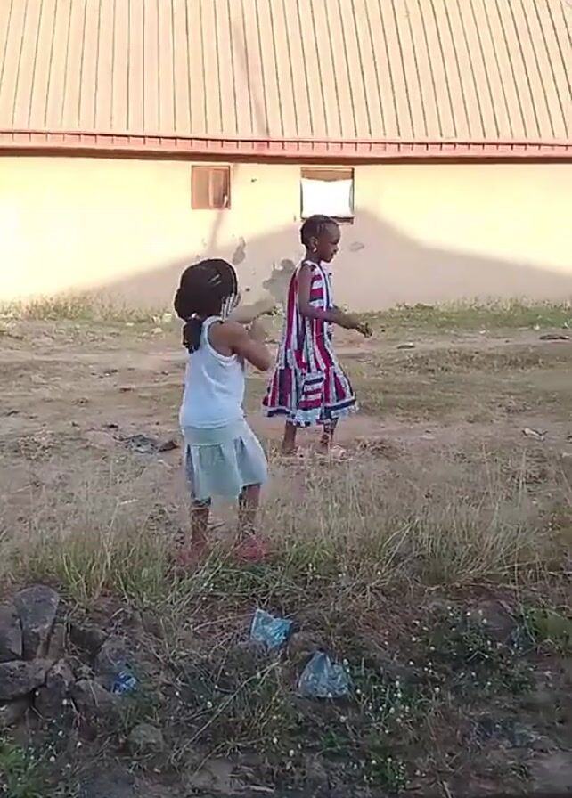 Two young girls are playing in a grassy area in front of a building. The building is one-story with a metal roof and two small windows. The girl in the foreground is wearing a white tank top and a light green skirt, while the other girl is wearing a colorful striped dress. The girl in the foreground is waving her arms and appears to be talking to the other girl. The ground is dirt and grass, with some rocks and trash scattered around. The sky is blue and clear.