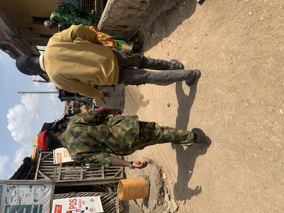 The scene depicts an unpaved pathway in Adankolo, Nigeria, under bright daylight