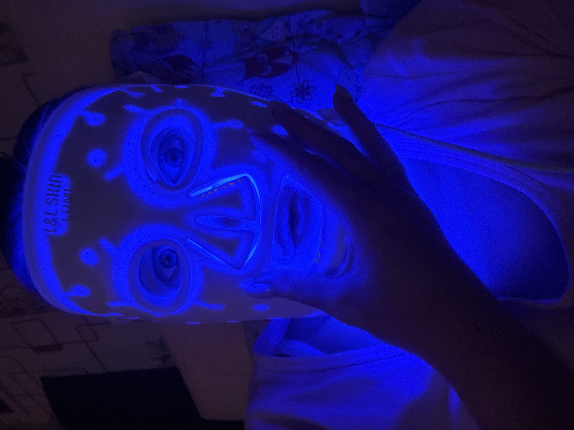 A person is wearing a blue LED light therapy face mask with the text "L&L SKIN LUMI" visible on the left side