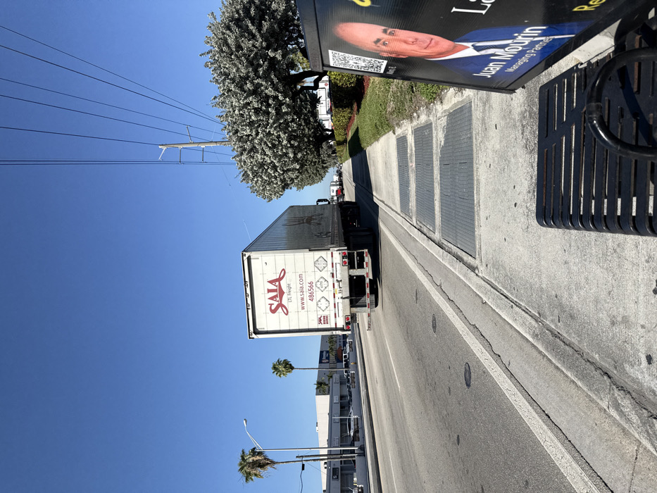 A bright sunny day highlights a street scene. A white semi-truck with "SAIA" in red lettering travels down the road. Palm trees and other greenery line the street. A sign featuring a man's face in a suit is partially visible. Metal grates cover part of the sidewalk next to a bench. Power lines stretch across the blue sky.