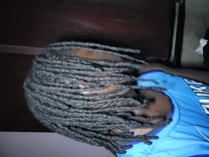 A person with dark skin and locs, wearing a light blue jersey, is captured in a low-angle shot. The focus is on their locs, which obscure their face. The person is positioned in front of a dark wooden surface, likely a cabinet or wall panel. A light-colored wall is visible in the lower portion of the image. The lighting is subdued, casting shadows that add depth to the image.