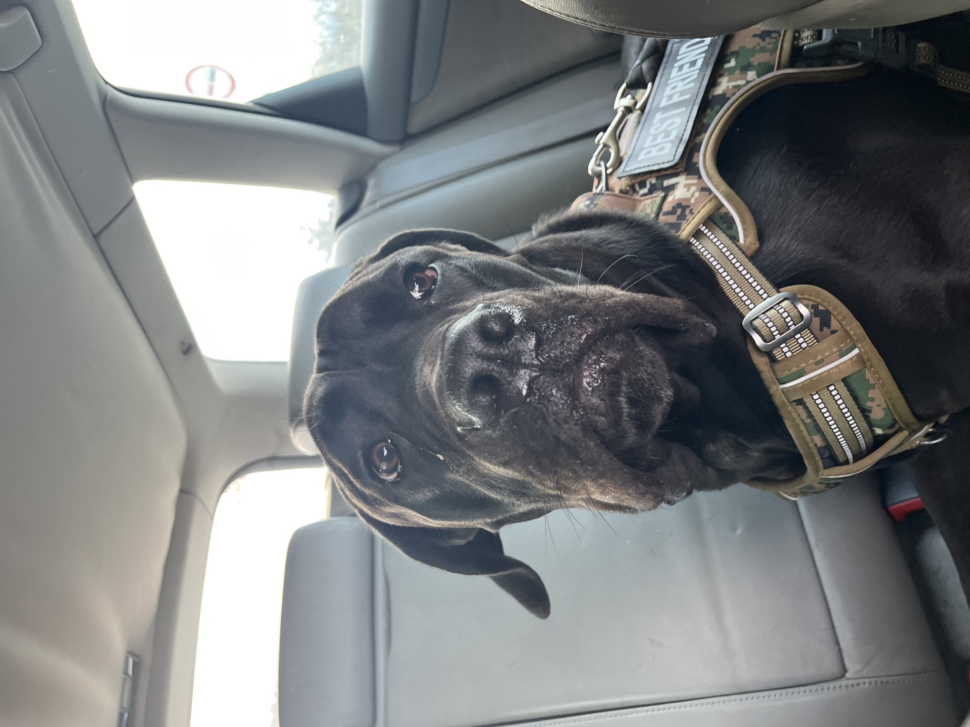 - "A large, dark-furred dog, consistent with a Mastiff breed, is positioned in the rear passenger compartment of a vehicle" by FM-dsQis2, licensed under CC BY 4.0