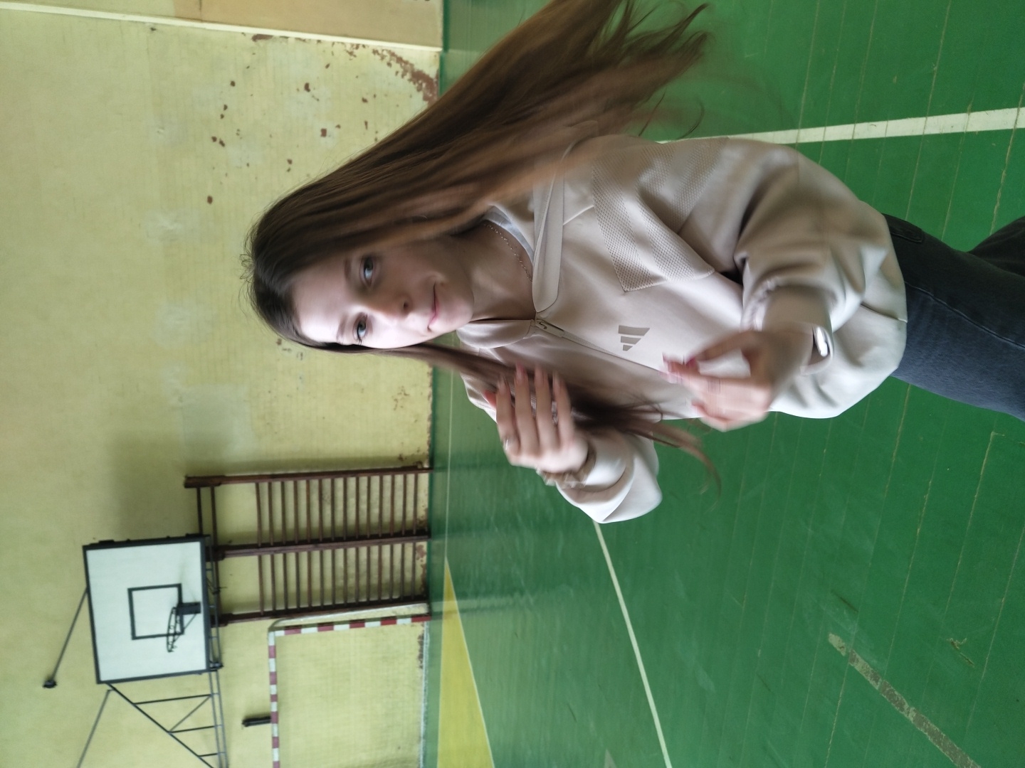 A young female is captured in an indoor sports hall in Tutrakan, Bulgaria. She has long brown hair, which is visibly in motion, sweeping towards the viewer's right. Her body is angled slightly to the left, and she looks directly at the camera with a neutral expression, her lips slightly parted. She is wearing a light beige, zip-up hoodie featuring a dark Adidas logo (three stripes) on the left chest, and dark-colored pants. A thin silver-toned chain necklace is visible, and a scrunchie is on her right wrist. Her fingernails are painted a pink/purple hue. Her hands are raised and appear blurred, indicating movement. The floor of the hall is a green sports court with white demarcation lines, and a section of yellow flooring is visible on the far left. The walls are painted a light yellow, exhibiting signs of wear, scuff marks, and discoloration. Fixed sports equipment in the background includes a white basketball backboard with a black rim and net mounted on the wall, a red and white striped goalpost frame partially visible on the left, and two sets of vertical wooden wall bars positioned to the right of the basketball hoop.