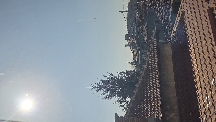 This image, captured in Kazichene, Bulgaria, presents an elevated view over a residential area under a clear, light blue sky. The sun is prominent and bright in the upper-left quadrant. The foreground is dominated by a sun-drenched terracotta tile roof, featuring distinct undulating patterns, which occupies the lower third of the frame. Behind this, successive layers of similar tiled roofs are visible, interspersed with the tops of various buildings, several of which feature chimneys. A tall, dark green evergreen tree stands centrally in the mid-ground, extending upwards into the sky and partially obscuring distant structures. To the right, utility poles with dark wires are present above a cluster of houses. A vehicle, possibly a car, is partially discernible among the background buildings. The scene is devoid of people or discernible activity, illuminated by direct sunlight which casts shadows and highlights textures across the urban landscape. Minor specks and streaks are visible, consistent with viewing through a pane of glass.