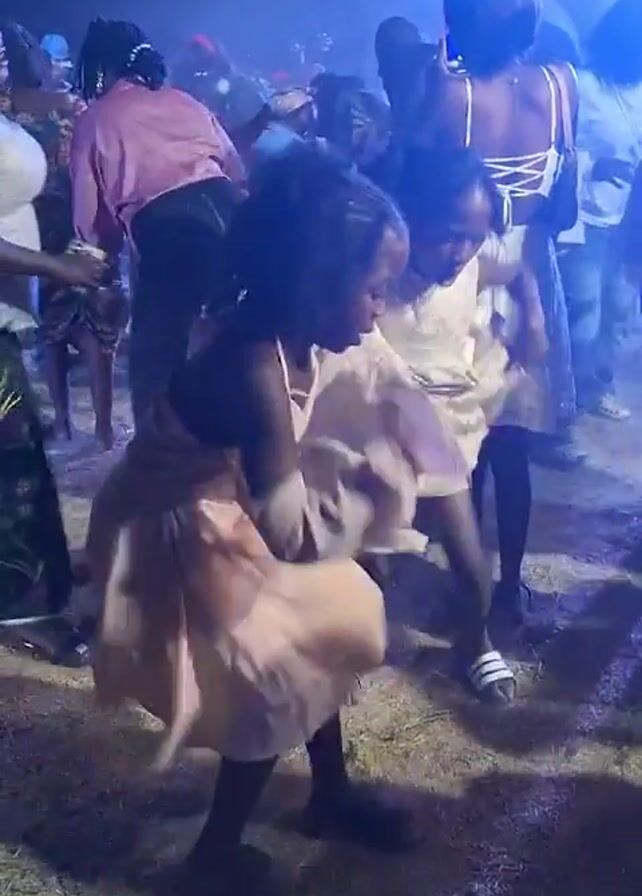 two young girls dancing together at an outdoor event. They are wearing light-colored dresses and appear to be enjoying themselves. The older girl has her hair loose, and she is twirling her dress as she dances. The younger girl is following her lead, twirling her own dress. There are other people dancing and watching in the background, some of them holding phones to record the scene. The lighting is dim, with blue and white spotlights illuminating the dance floor. The ground is rough and appears to be dirt or grass.