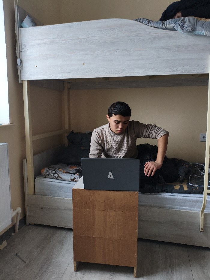 The image displays an indoor scene within a room in Shahrisabz City, Uzbekistan. A young male, dressed in a light brown textured long-sleeved sweater, is seated on the lower bunk of a light-colored wooden bunk bed. He is looking down at a dark grey laptop with a white 'A' logo on its lid, which is placed on a simple, light brown wooden nightstand acting as a table. The lower bunk features a mattress with patterned bedding and a dark duvet, while the upper bunk contains a mattress, a light blue pillow, and a dark blanket partially obscuring the head and shoulder of another individual. A window on the far left illuminates the scene, with a white radiator positioned below it. The walls are a plain beige, and the floor is light grey laminate. A white electrical outlet is visible on the right wall. A thin, dark object rests on the floor near the window.