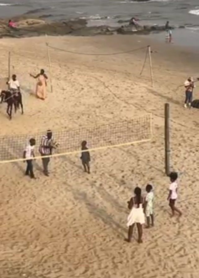 sunny beach scene with a volleyball net in the foreground. A group of children and one adult are playing volleyball. The adult wears a black and white striped shirt and is near the net. To the left of the volleyball game, a person is riding a horse while another person stands nearby. In the background, people are seen near the shoreline, and a musician plays a guitar. The ocean stretches out in the distance.