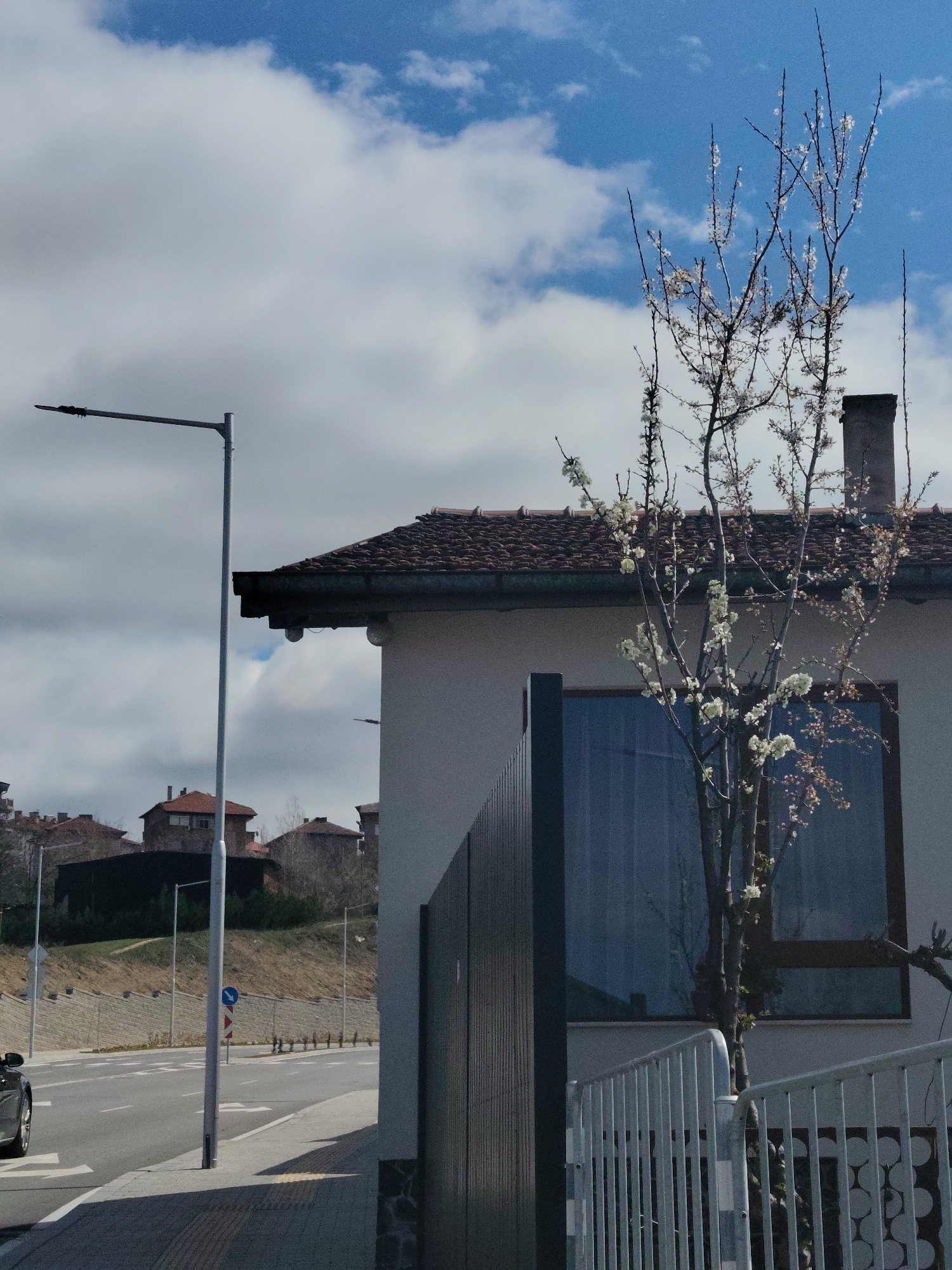 The image depicts a street scene in Blagoevgrad, Bulgaria, on a partially cloudy day. A light gray, one-story building with a brown-tiled roof and a chimney is positioned on the right side of the frame. A blooming tree with white flowers stands in front of a large window in the building. A dark gray fence runs along the side of the building, and a white metal railing borders the foreground. To the left of the building, a gray street lamp stands on the sidewalk, next to a paved road with a median. In the background, residential buildings are visible on a terraced hillside, with a retaining wall along the base of the hill. A car is partially visible on the left side of the road. A traffic sign is noticeable on the roadside near the car. The sky is blue with white clouds.