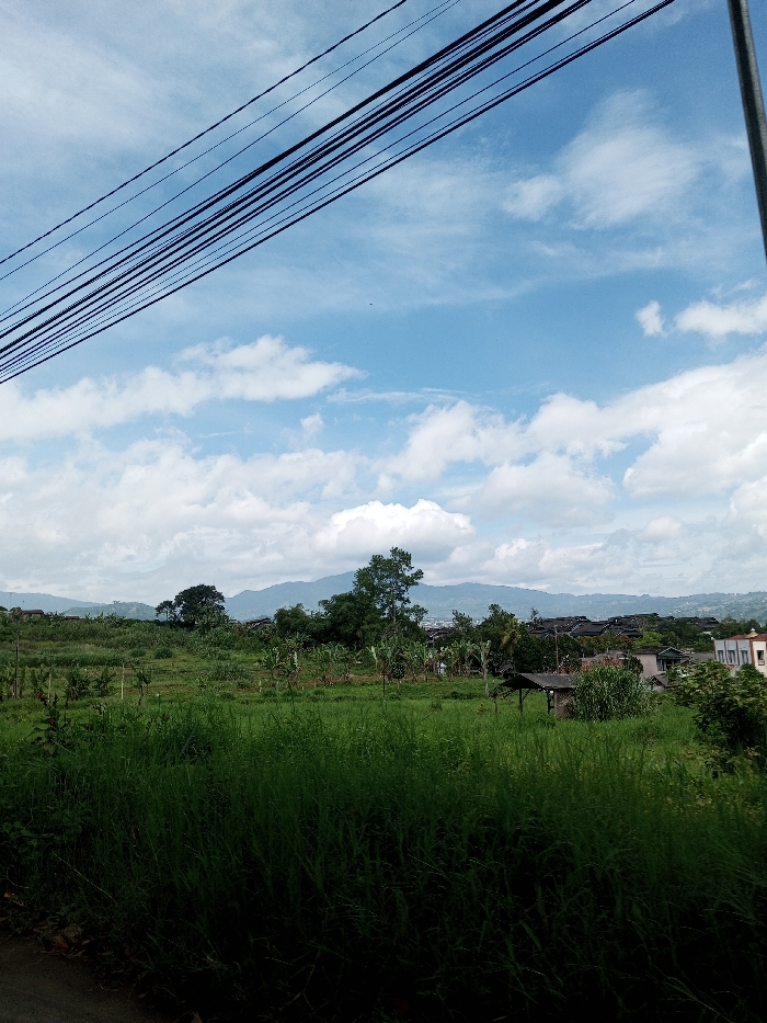 The image depicts a rural or semi-urban landscape in Ariyalai, Sri Lanka, observed under a partly cloudy blue sky. The upper portion of the frame is dominated by a clear blue sky interspersed with scattered white cumulus clouds. Multiple dark, parallel utility lines traverse the upper left quadrant of the sky diagonally, extending from the right edge of the frame, where a vertical segment of a utility pole is visible. The midground features an expanse of lush green vegetation, primarily consisting of tall, dense grass in the foreground, occupying approximately the lower third of the image. Beyond this grass, a field contains rows of cultivated plants, including young trees or crops with broad leaves, and several thin stakes indicating agricultural activity. In the middle distance, several trees are scattered, with a prominent, large dark green tree located slightly right of center. To its right, a small, dark, single-story structure with a sloped roof is visible amongst the foliage. Further in the background, a cluster of buildings with dark roofs and lighter-colored walls suggests a residential area. On the far right, a multi-story building with white facades and dark windows is partially visible. The distant background consists of undulating green hills or mountains under a lighter sky, forming the horizon line. No people or animals are visible in the scene. The lighting indicates clear daylight conditions.