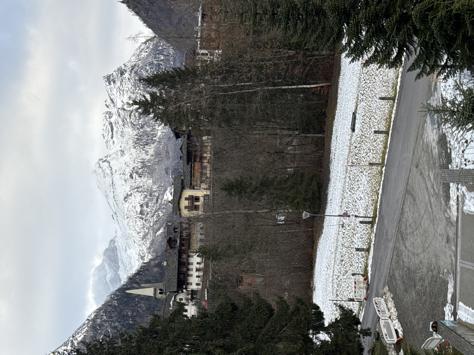 A snowy mountain landscape overlooks a European village. Buildings with dark roofs and light facades nestle among bare trees. Patches of snow cover the ground and the mountain peaks are shrouded in white. A road with a strip of snow-dusted grass runs parallel to the trees. A streetlight stands near the roadside. The sky is overcast and grey.