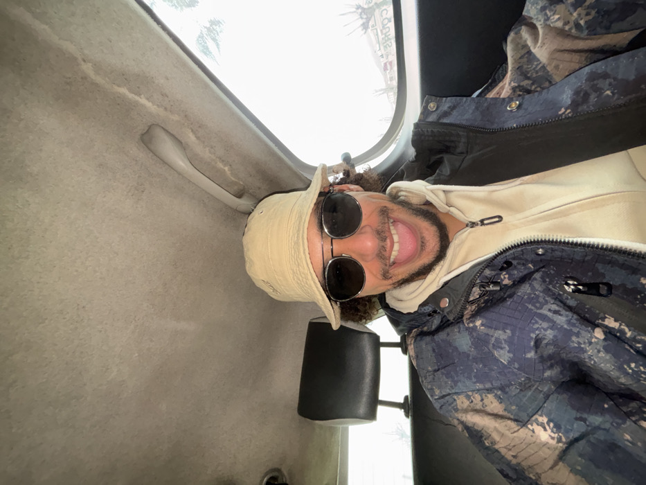A male individual, appearing to be in his 20s or 30s, is photographed in a medium shot from the back seat of a vehicle in Tétouan, Morocco. He has curly dark hair and is wearing a beige bucket hat with a dark emblem, dark-rimmed round sunglasses, a light beige hooded sweatshirt, and a dark blue/green/beige camouflage-patterned jacket. The individual is smiling broadly, with an open mouth revealing teeth and a partially extended tongue, looking directly at the camera. The vehicle's interior features a heavily stained and worn light-colored fabric headliner, exhibiting dark streaking and discoloration. A light grey plastic grab handle is visible above the right passenger window. The top of a dark-colored front seat headrest is visible behind the subject. Through the passenger window, a bright, overcast exterior is visible, showing blurred white buildings and partial French text on a distant sign, including the word "COURS," indicative of an urban street environment.