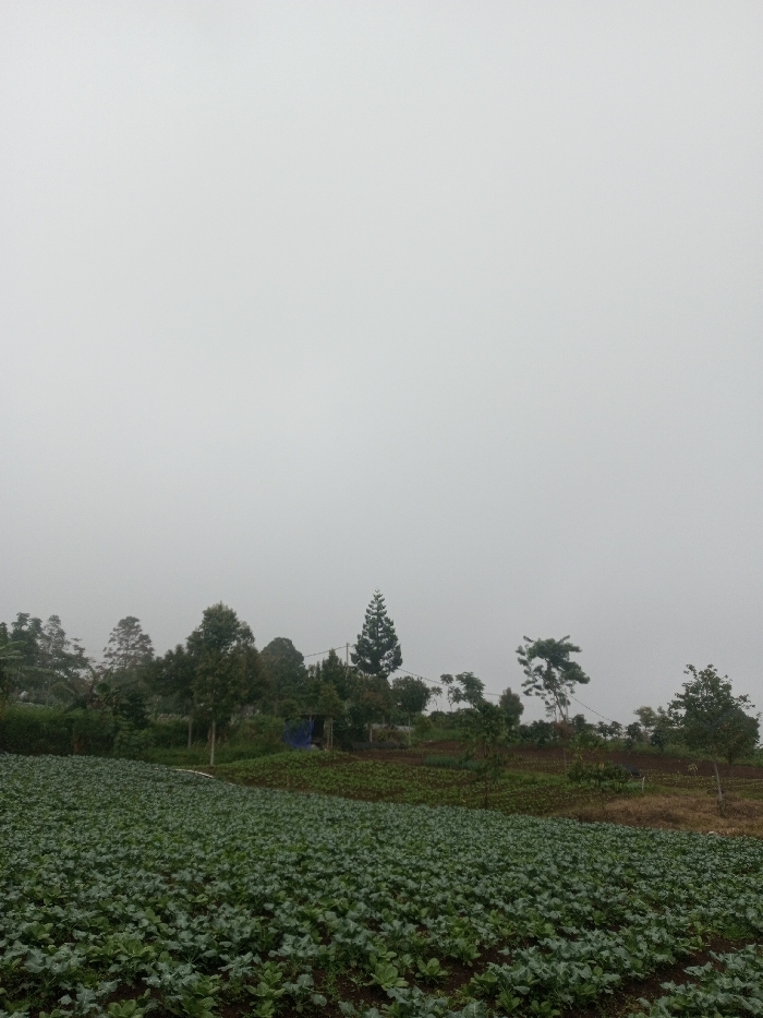 This image presents an agricultural landscape in Joshi Vihir, India, under heavily overcast conditions. The foreground features a vast field of uniformly planted green leafy vegetables, likely a crop such as cabbage, arranged in discernible rows across dark brown soil. In the midground, a varied line of trees, including both broadleaf and coniferous species of differing heights, stretches horizontally. A small, rudimentary structure with a blue tarp roof is partially visible amidst these trees towards the left. Beyond the primary field, a secondary cultivated area with sparser, lighter green growth is present. The entire upper half of the image is filled with a uniform, light grey sky, indicating dense fog or cloud cover, obscuring any horizon or distinct atmospheric features. No individuals, animals, or explicit human actions are visible in the scene.