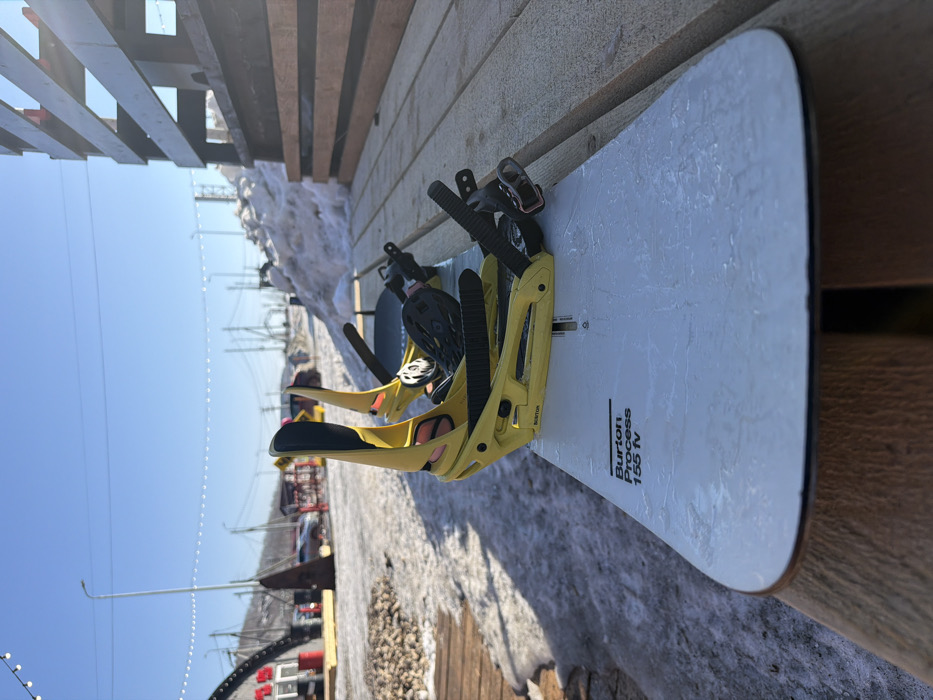 - "A white Burton Process 155 fv snowboard with bright yellow Burton bindings rests on a light brown wooden slatted surface, likely a bench or deck, under a clear blue sky" by FM-gimGn1, licensed under CC BY 4.0