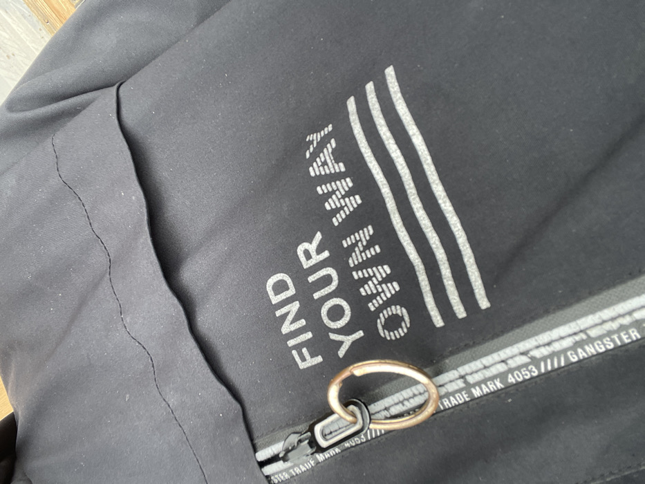 A close-up, slightly elevated perspective captures a dark gray fabric garment, likely synthetic, exhibiting scattered fine white particles. A horizontal fabric flap, secured by a single wavy seam, is visible across the upper portion of the frame. A black zipper runs diagonally from the lower left, featuring a black pull tab to which a single, smooth, gold-colored, oval-shaped metal ring is attached. Silver text, "FIND YOUR OWN WAY," is printed in uppercase sans-serif font on the garment, followed by three parallel horizontal silver stripes. The zipper tape displays white text including "TRADE MARK 4053" and "GANGSTER." The garment rests on a light-colored surface, possibly wood, visible at the top and right edges. The specific location within Juta, Georgia, is not discernible from the image. No individuals are present.