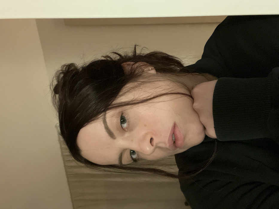 A young woman with dark hair partially pulled back and green eyes looks directly at the camera. Her face is close to the lens, and her hand is visible near her neck. She wears a dark sweater or jacket. The background is indistinct, appearing to be a wall with a light fixture or ledge above her. The image is slightly rotated counter-clockwise.