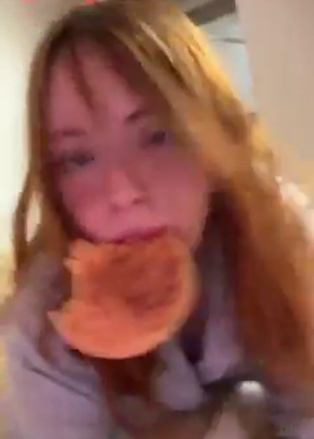 A red-haired woman is lying on a bed, eating a waffle. She is lying on her stomach and her feet are raised in the air. She has fair skin and blue eyes. She wears eyeliner. There is a red pennant banner hanging above her. The bed is covered with a yellow and white sheet.