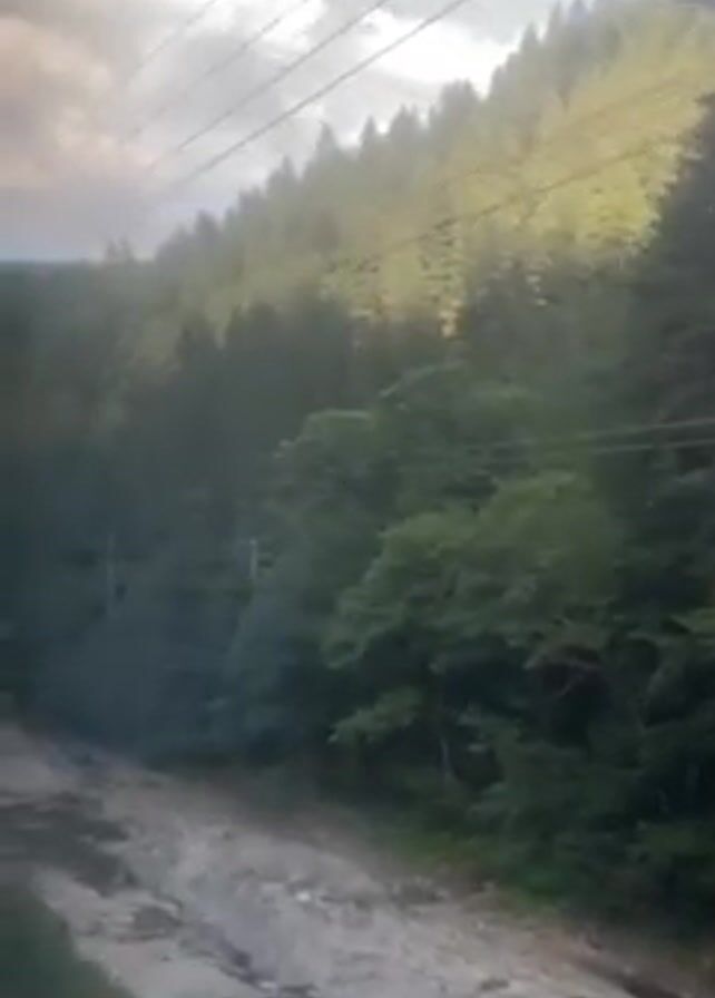 The video displays a landscape shot from a moving train. A river flows alongside the train tracks, appearing swollen with murky water. A concrete bridge spans the river. Dense green forest covers a sloping hillside, with numerous tall evergreen trees prominent. Power lines stretch across the upper part of the frame against a sky partially obscured by clouds. The lighting is bright, but hazy, as if the sun is filtered through the clouds.