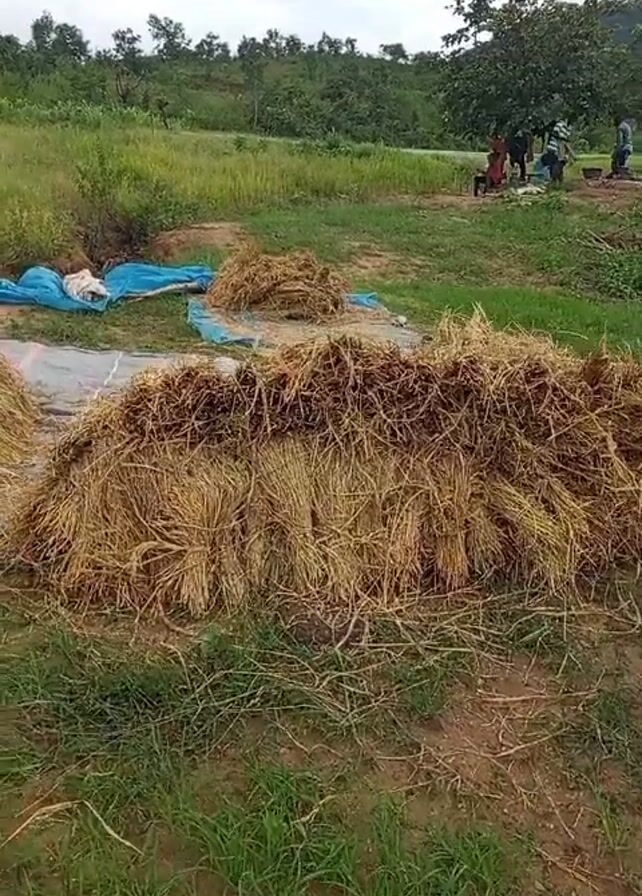 The video depicts a field with several piles of bundled hay or straw scattered across the foreground. These piles are laid out on top of blue tarps and a gray sheet. In the background, a group of people are gathered, likely working or processing the harvested material. The surrounding environment includes green vegetation, a few trees, and a cloudy sky. The scene suggests a rural or agricultural setting, possibly during harvest season.