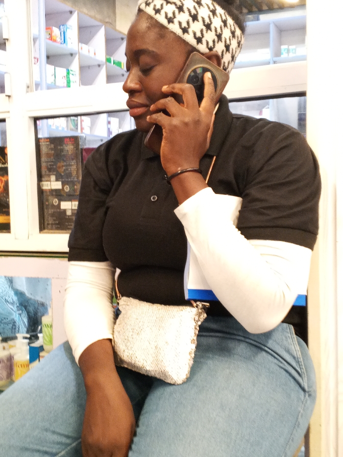 A dark-skinned female is depicted in profile, facing left, engaged in a phone call within what appears to be a commercial establishment in Tarauni, Nigeria