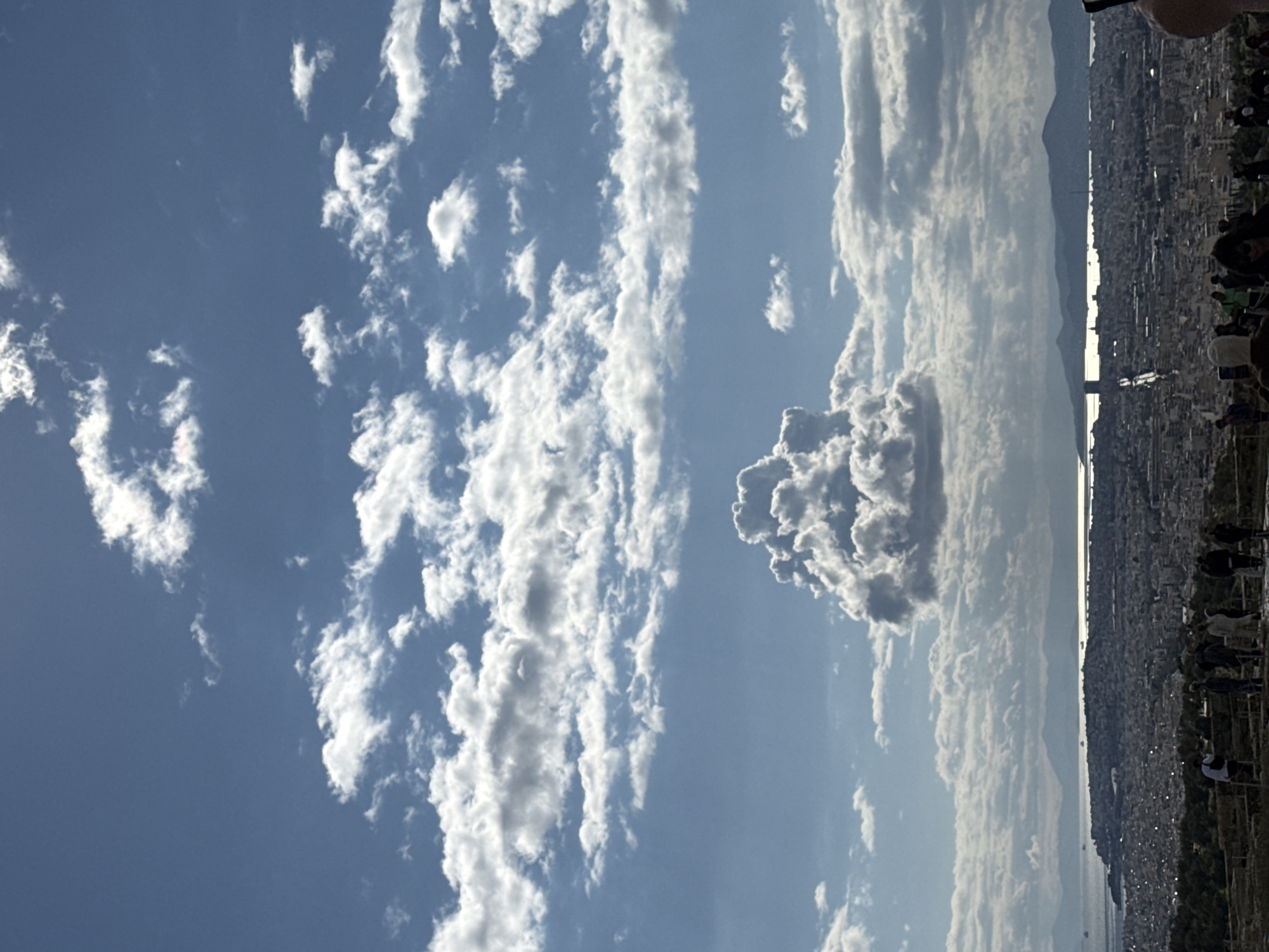 view of Athens, Greece, with a blue sky dotted with cumulus clouds