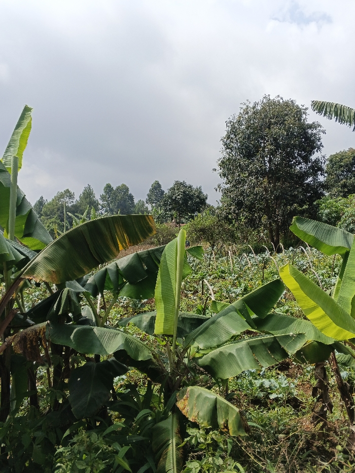A vibrant hillside scene unfolds under a cloudy sky. Banana trees with large, green leaves dominate the foreground, some showing signs of age. Beyond, a field of cultivated crops extends up the hill. Lush, green trees fill the midground. The upper portion features more trees and a grey sky.