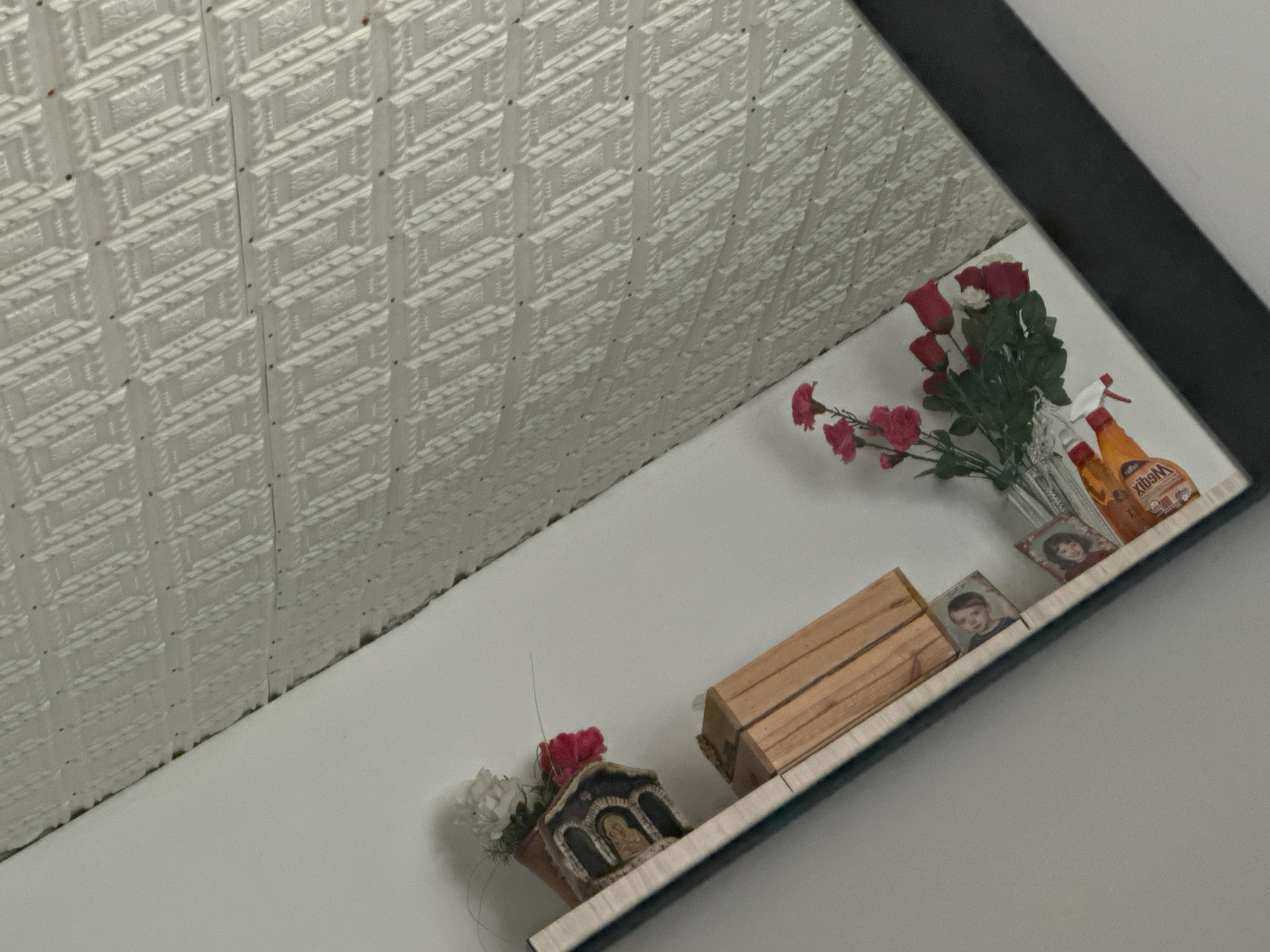 The image depicts a shelf with various items, reflected in a mirror. On the shelf, there are flowers in a vase, a bottle of Windex, two framed pictures of people, a wooden object, and a small decorative structure resembling a shrine with flowers. The background behind the shelf appears to be a wall with a textured pattern. There is no verifiable information within the image to suggest a location in the city of Smyadovo, Bulgaria. The setting seems to be an indoor space, potentially a home. There are no visible people in the mirror or the scene.