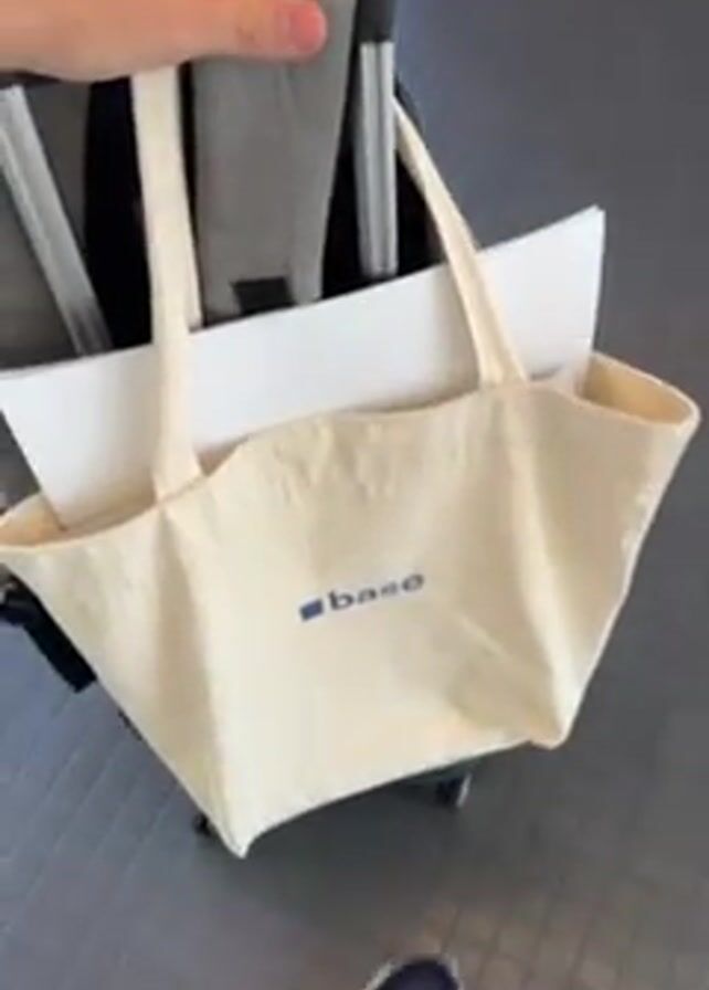 A person is pulling a rolling suitcase down a corridor. A cream colored tote bag with "base" in blue letters is attached to the handle. The corridor has a gray floor. A person is walking in the same direction ahead of the camera. A red wall is to the left of the camera. The right side of the corridor is mostly white.