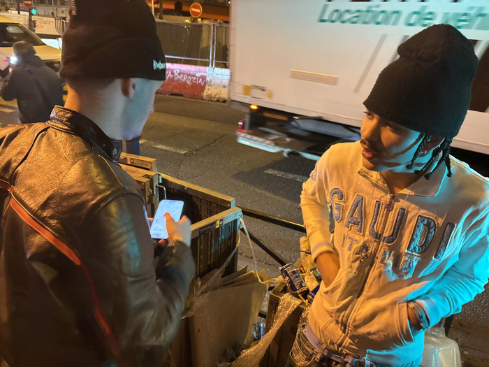 Two young men stand on a city street at night. The person on the left wears a brown leather jacket, a black beanie, and holds a phone. The other person wears a white zip-up hoodie with "GAUDI ITALIA" printed on it, a black beanie, and has dreadlocks. They appear to be conversing near a makeshift structure made of cardboard and metal. A white truck with green lettering is visible in the background, along with street lights and a person holding a phone further away.