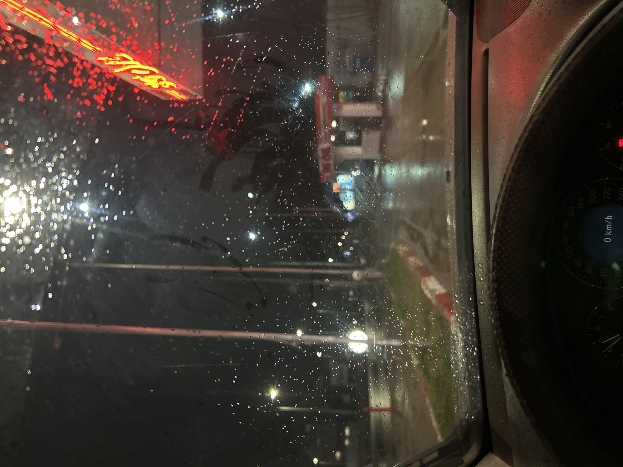 The image, taken from inside a vehicle on a rainy night, shows a blurred view through the windshield