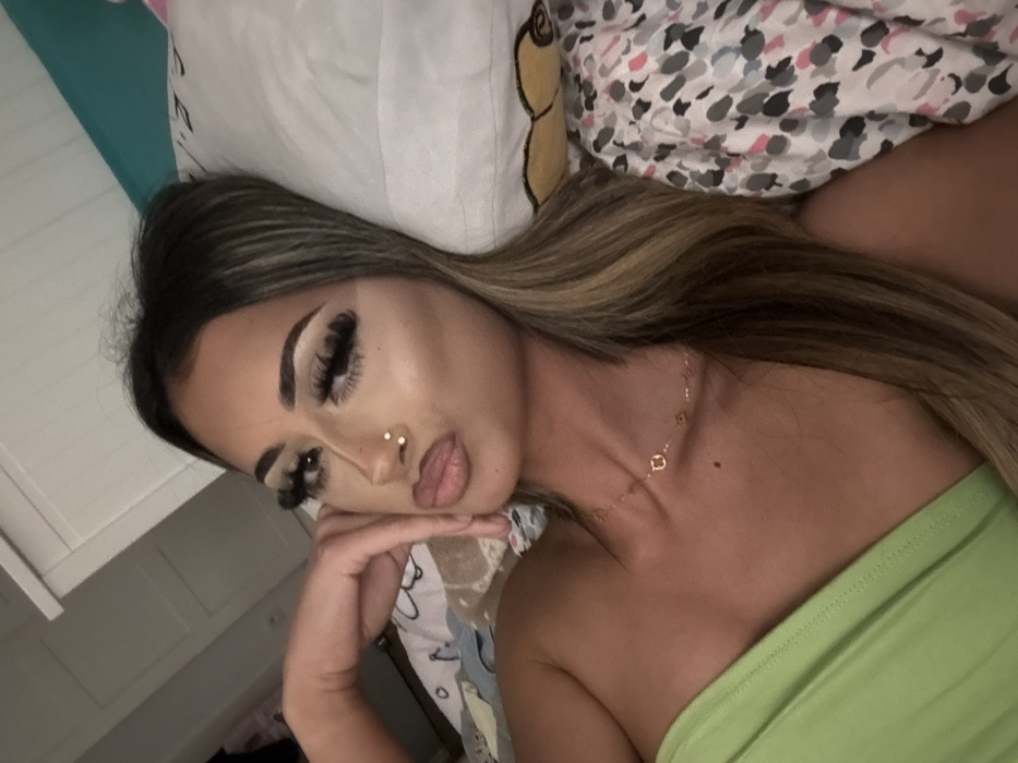 A young woman with long, highlighted hair lies on a pillow, gazing directly at the camera. She has bold makeup, including thick lashes and defined eyebrows. Her bare shoulder is visible, clad in a light green strapless top. A delicate gold necklace adorns her neck. She props her head up with one hand, her fingers visible near her face. The background includes part of a bed and a glimpse of a white dresser.