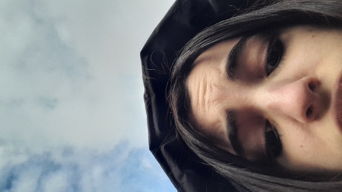 The image depicts a close-up, upward-angled view of a person's head and upper face against a cloudy sky in Meistratzheim, France. The subject is a female with dark hair, visible from the forehead to below the nose. Her brow is furrowed, indicating a strained or contemplative expression, and her eyes are cast downwards. She is wearing a black hood, which frames the top and sides of her head. Dark eye makeup is visible around her eyes. The background consists of a partially overcast sky with white and grey clouds against patches of blue. No other individuals, objects, or environmental details are discernible.