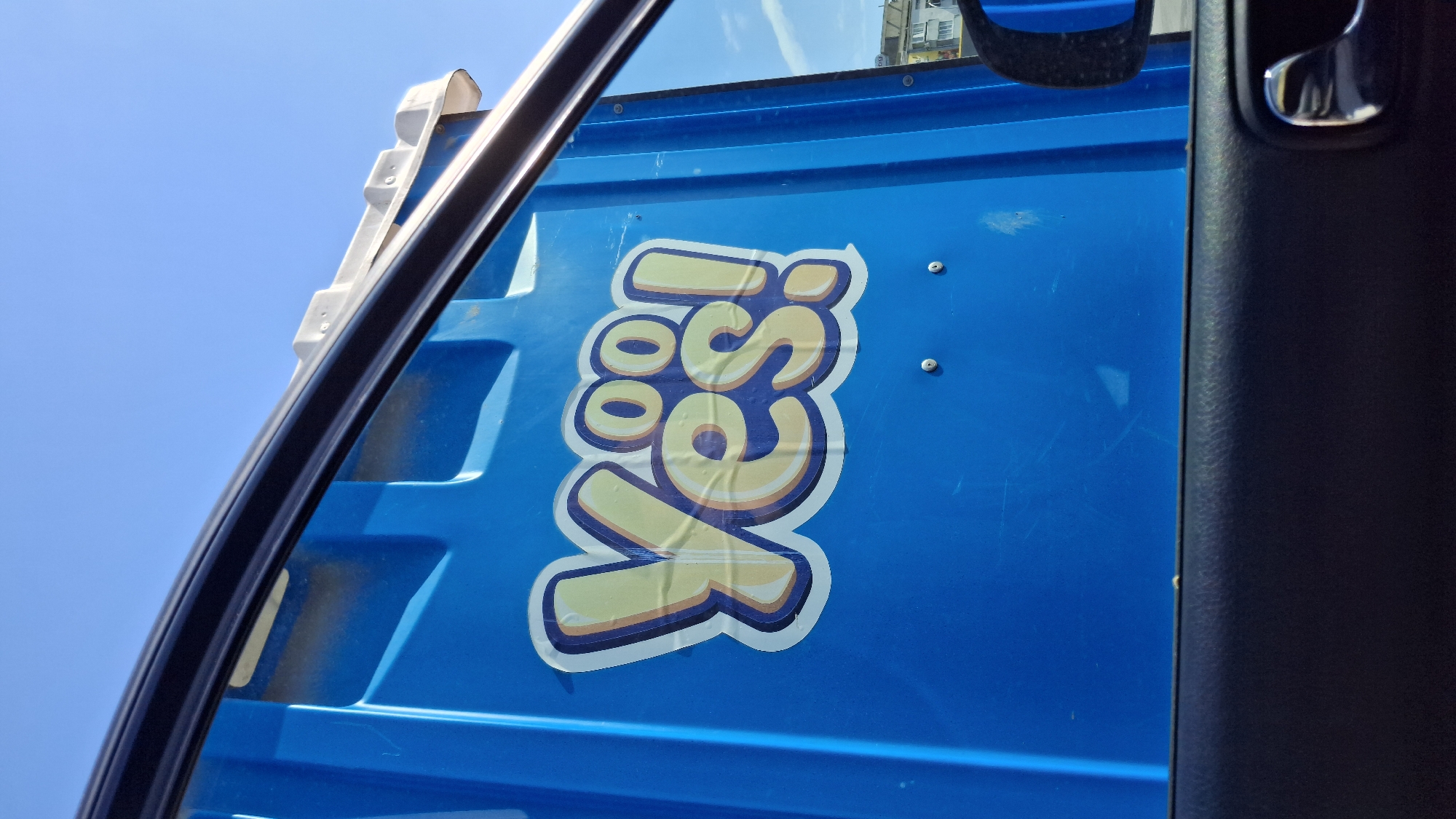 side of a blue portable toilet, likely located somewhere in Varna, Bulgaria, with a sticker that says "YooSi" in a stylized font. The words are vertically oriented, one above the other. The sticker has a light yellow fill and a darker brown outline. The portable toilet is viewed from the interior of a vehicle or another structure, with a black frame and a rearview mirror visible on the right side of the image. Part of the portable toilet's access steps are visible on the left. The background is a clear blue sky. There are a couple of rivets or screws visible on the blue surface behind the sticker.