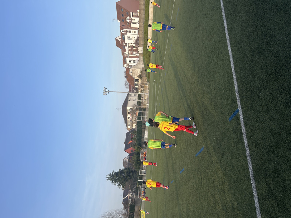 An artificial turf football pitch in Bischheim, France, is observed during late afternoon under a clear blue sky