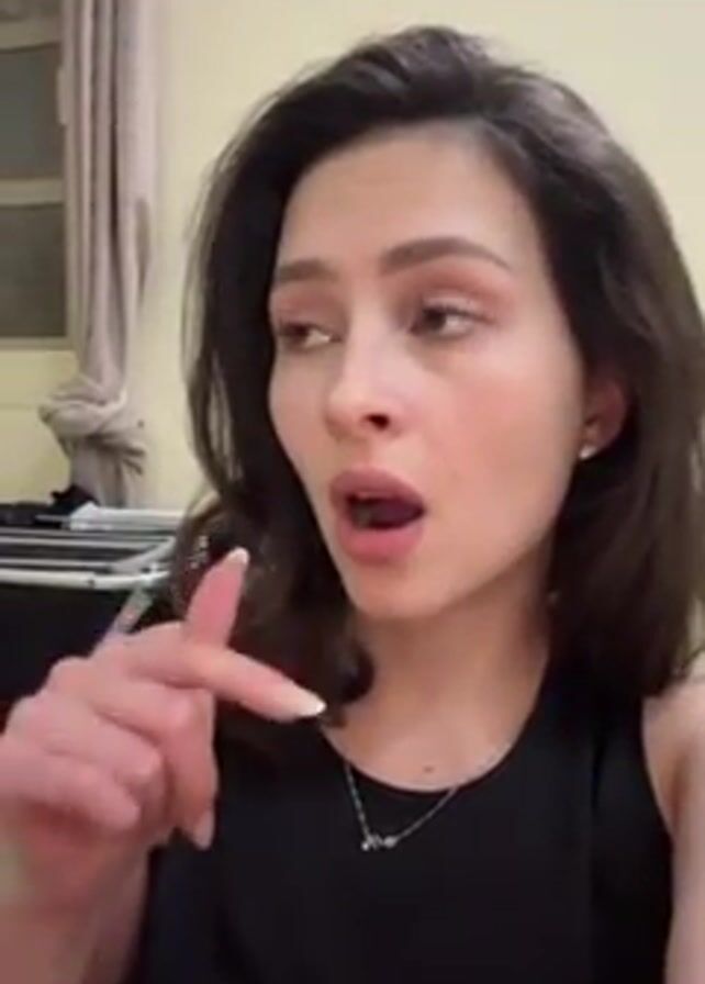 A woman with brown hair and light complexion is centered in the frame. She wears a black sleeveless top and a silver necklace with a small pendant. She is pointing downwards with her right index finger and has her mouth open, seemingly singing or vocalizing. The background includes a beige wall, a drying rack with clothes, and a curtained window.