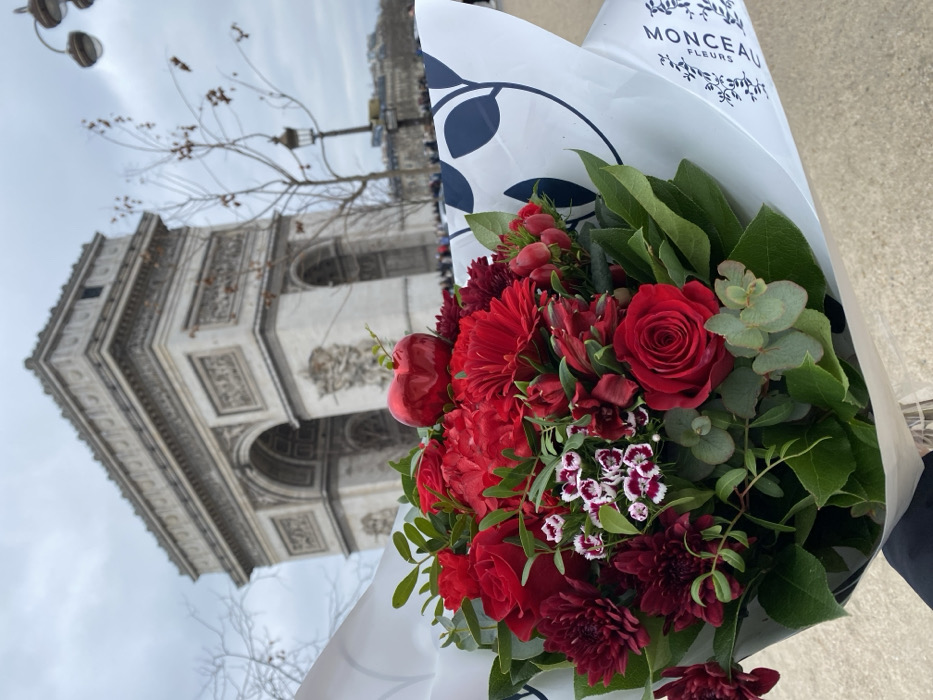 The image displays a close-up of a vibrant floral bouquet held by an unseen individual's dark-clad hand or arm in the lower foreground. The bouquet is primarily composed of various red flowers, including multiple red roses, deep red chrysanthemums, and smaller dark red and white variegated blossoms, complemented by green foliage such as eucalyptus leaves. A small, shiny red heart ornament is nestled within the arrangement. The bouquet is wrapped in white paper featuring a distinct black and blue graphic pattern and the visible text "MONCEAU FLEURS." In the blurred background, the Arc de Triomphe, a prominent landmark, is clearly identifiable in Paris, France. The sky is overcast and grey. Bare deciduous trees frame the monument on both sides, and a multi-headed street lamp is visible on the right. A crowd of people can be faintly discerned near the base of the Arc de Triomphe, and other urban structures are visible in the distant background. The ground appears to be a paved outdoor surface.