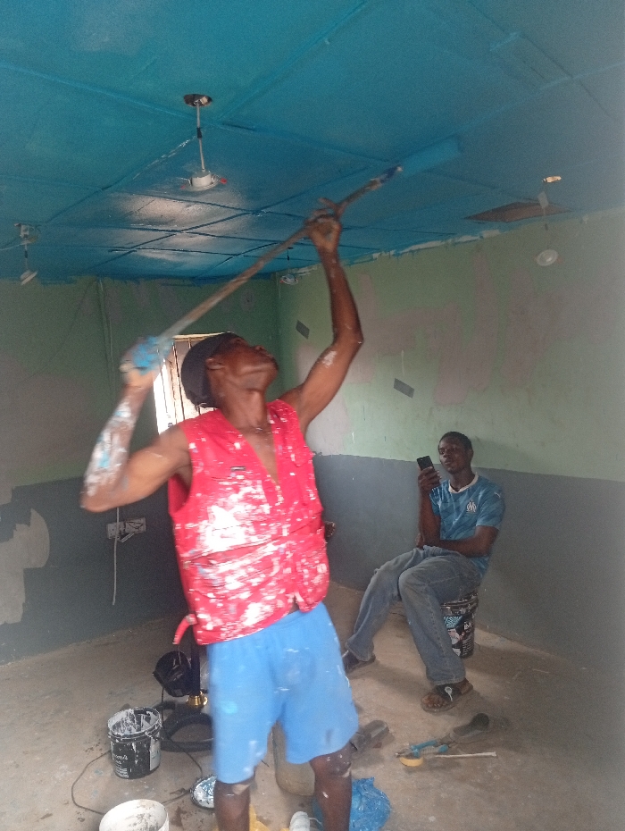 The image captures an interior room in Lugbe, Nigeria, during a painting operation