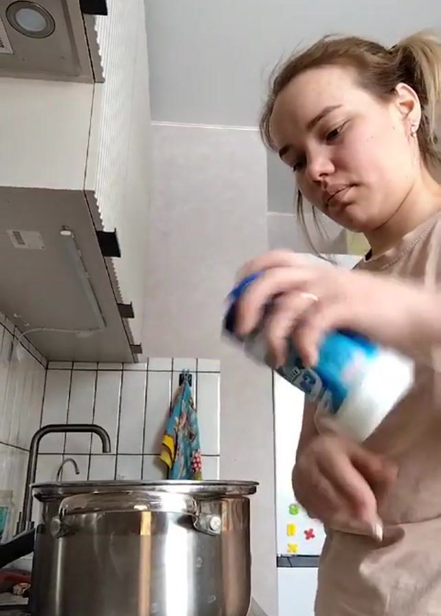 young woman in a kitchen adding salt from a blue and white container into a large stainless steel pot sitting on a gas stovetop. The gas is on under the pot. The kitchen has white and grey cabinets, white tiled walls, and the woman is wearing a beige shirt and has her blonde hair pulled back.